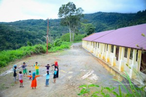 Bermain bersama anak-anak kelas membaca terbata-bata di halaman SD Serempah
